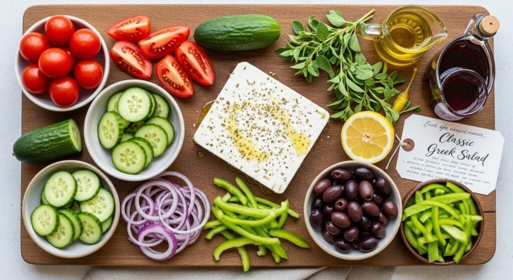 Crafting the perfect Greek salad hinges on the quality and freshness of your ingredients. Here’s what you’ll need, along with some insightful substitutions to keep things interesting: