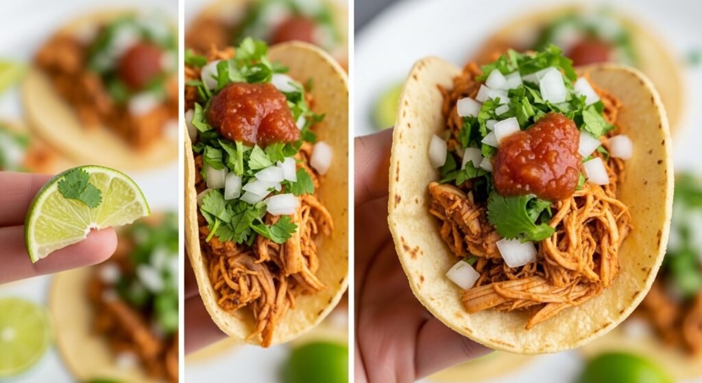 Warm your corn tortillas in a dry skillet over medium heat for about 15-20 seconds per side, or until soft and pliable. A quick char on the edges adds an extra layer of flavor. Serve the warm tortillas piled with the shredded chicken, fresh cilantro, diced white onion, and a squeeze of lime. Don’t forget your favorite salsa and a dollop of fresh guacamole!